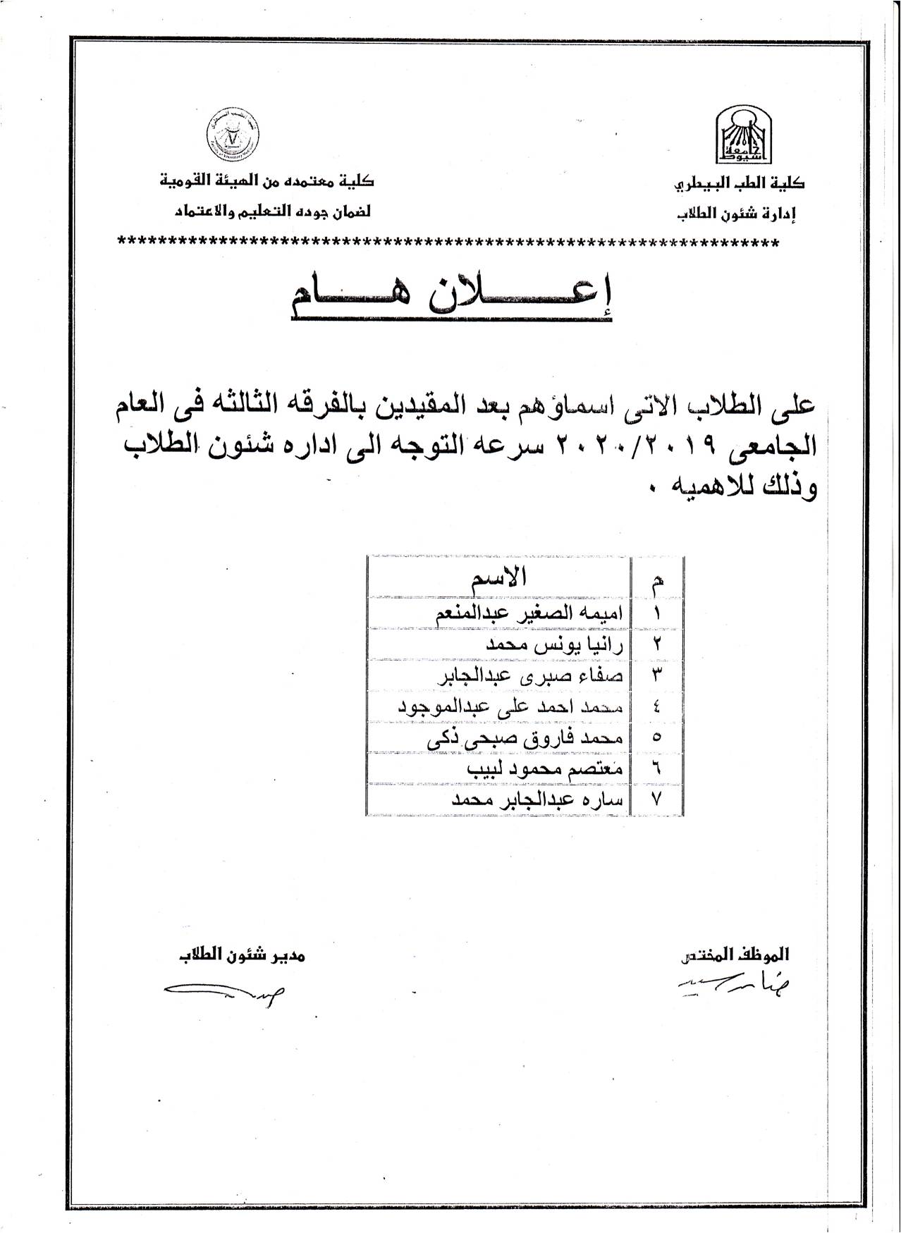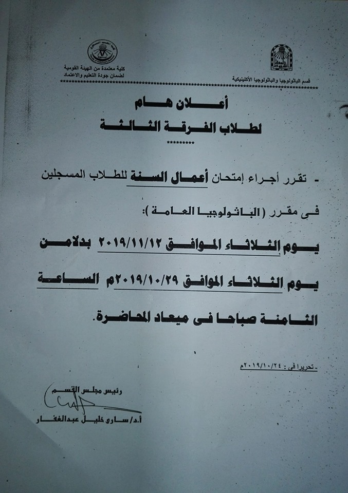 تتقدم السيدة أ.د. مديحة درويش . عميد الكلية . والسادة الوكلاء . وأسرة الكلية . بخالص التهانى القلبية إلى السيد أ.د. صابر عبدالمتجلى حسنين قطب. وذلك بمناسبة تولى سيادته منصب رئيس مجلس قسم صحة الحيوان والدواجن والصحة البيئية