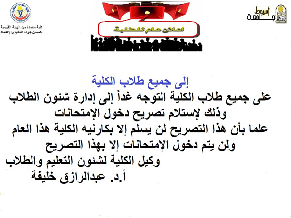 على جميع الطلاب مراجعة جدول التخلفات لاستبعاد اى تعارض فى امتحانات المواد فى حالة وجود تعارض التوجه لشئون الطلاب حالا