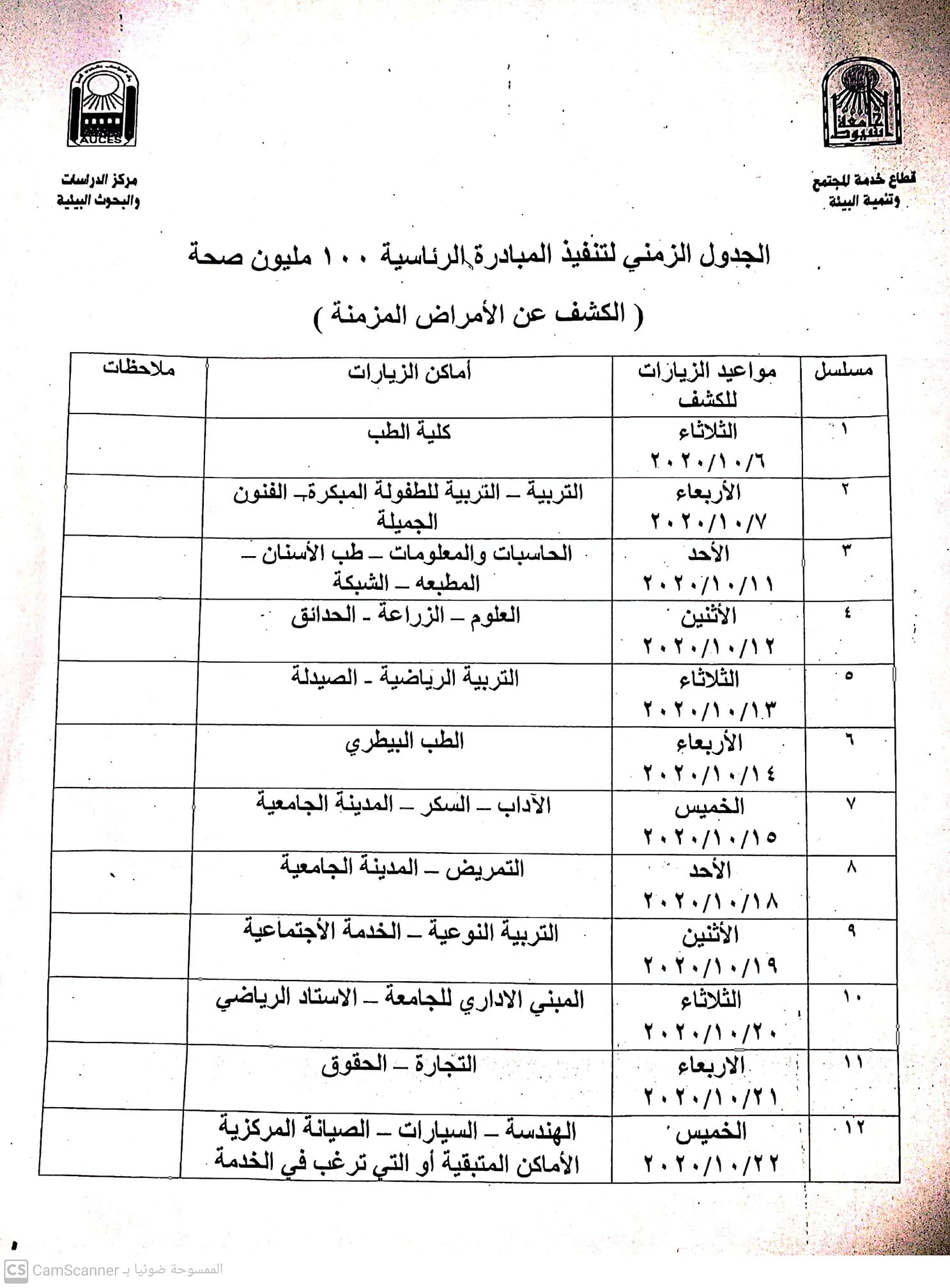 الكشف عن الامراض المزمنة ) وذلك من خلال التعاون بين الجامعة ومديرية الصحة وسوف تتواجد فرق الفحص الطبى المشاركة لتنفيذ المبادرة وفق الجدول الزمنى