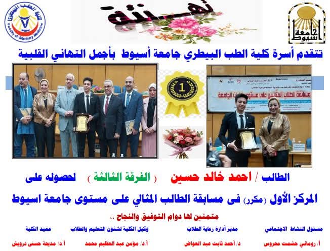 تهنئة : تتقدم اسرة كلية الطب البيطري بأجمل التهاني لطلابها الفائزين فى مسابقة الجامعة