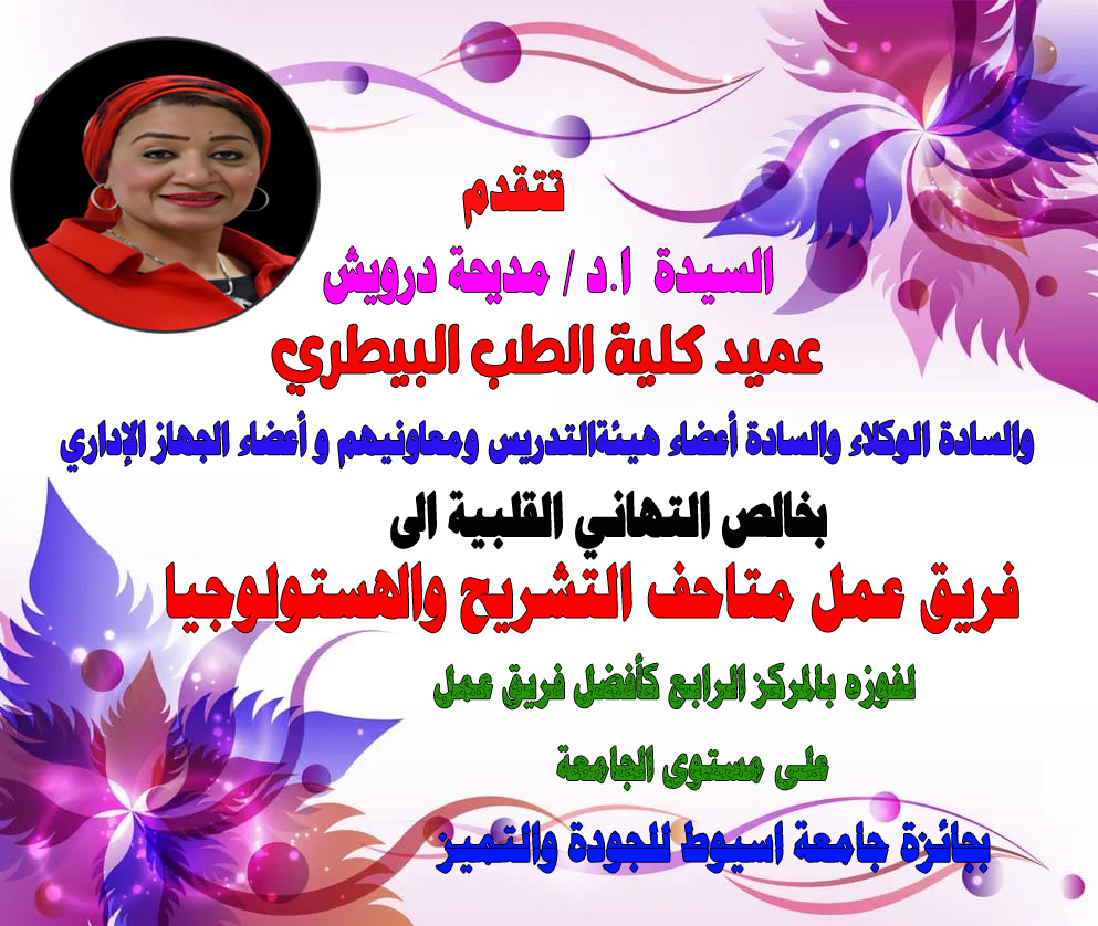 تهنئة : فوز فريق عمل متاحف التشريح والهستولوجيا بالمركز الرابع كأفضل فريق عمل بجائزة جامعة اسيوط للجودة والتميز 29 أبريل 2024 إنا لله وإنا إليه راجعون ... البقاء لله
