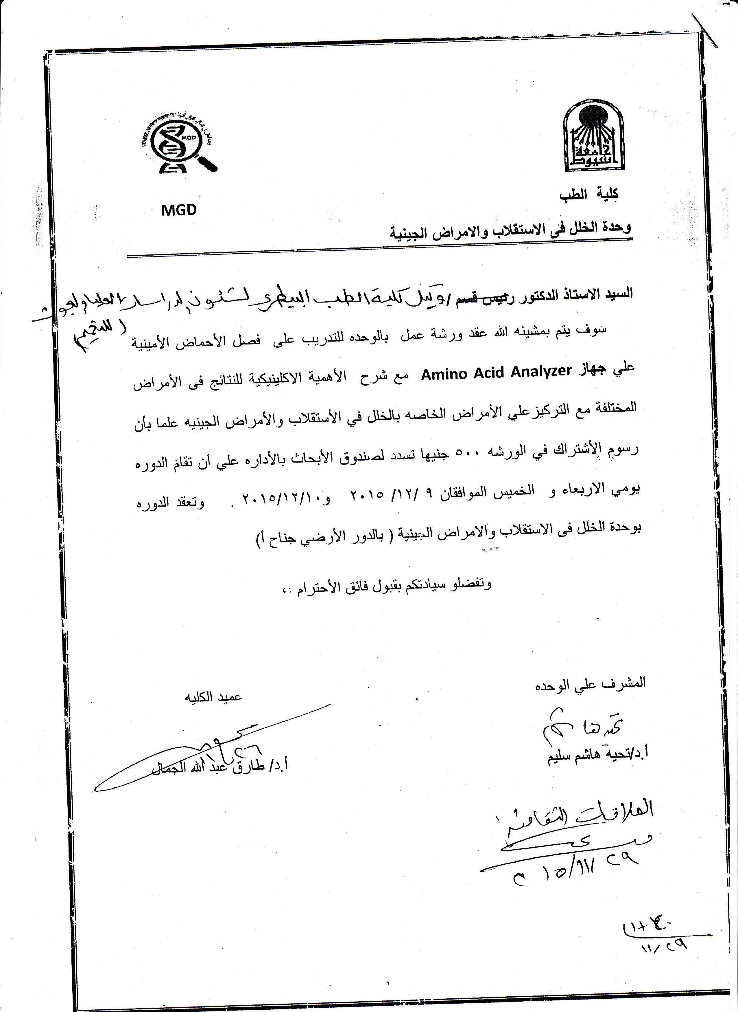 ورشة عمل للتدرب على فصل الأحماض الأمينية على جهاز Amino Acid Analyzer 30 نوفمبر 2015 ورشة عمل للتدرب على فصل الأحماض الأمينية على جهاز Amino Acid Analyzer