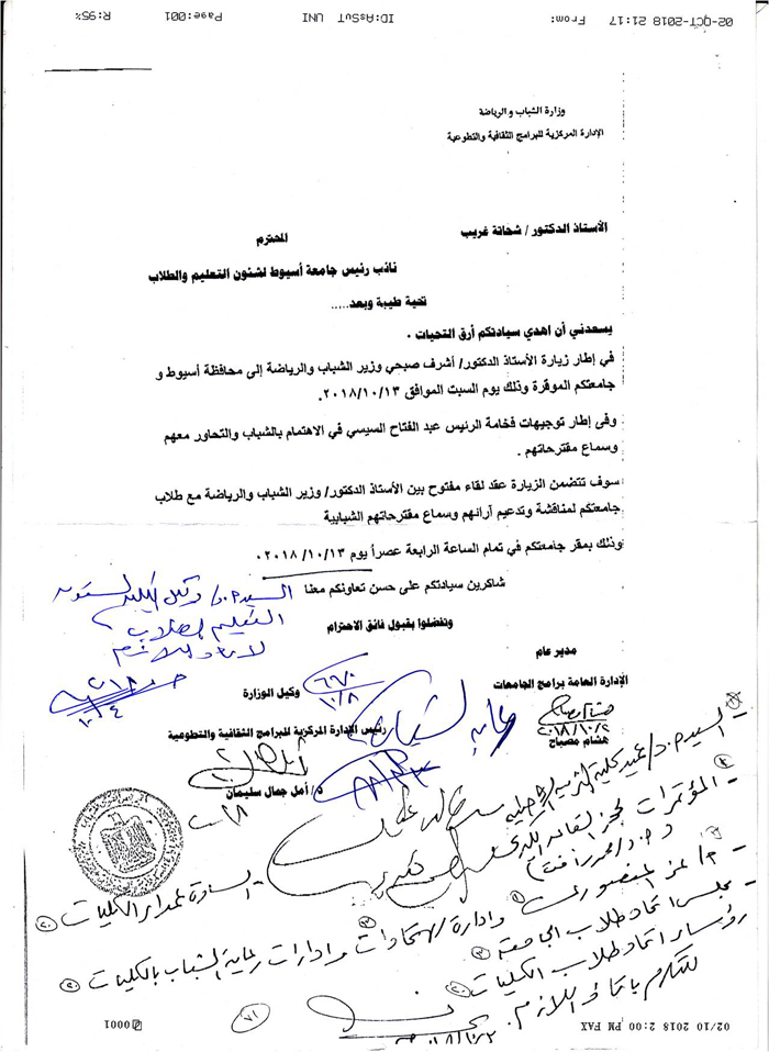 يقوم السيد / وزير الشباب والرياضة بزيارة إلى جامعة أٍيوط يوم السبت 13/10/2018