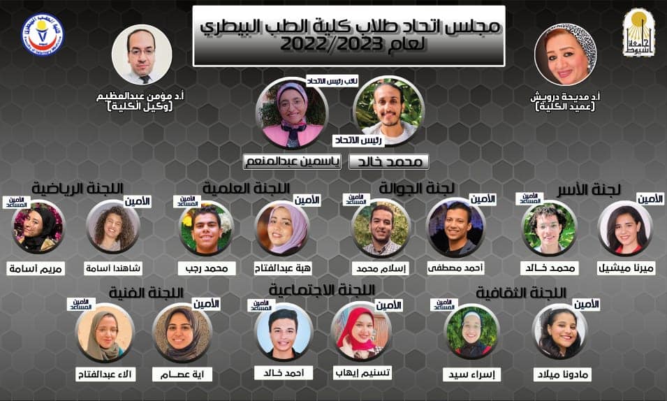 تتقدم اسرة كلية الطب البيطرى متمثلة في السيدة عميد الكلية / ا.د مديحة درويش والسادة الوكلاء ا.د/ مؤمن عبد العظيم وكيل الكلية لشئون التعليم والطلاب وا.د/ حسن عبد الصبور وكيل الكلية لشئون خدمة المجتمع وتنمية البيئة وا.د/ أيناس عبد الحافظ وكيل الكلية لشئون الدراسات العليا والبحوث والسادة رؤساء الأقسام والسادة أعضاء هيئة التدريس ومعاونيهم والسادة العاملين بالكلية بخالص التهاني لابنائنا الطلاب بمناسبة تنصيبهم لمجلس اتحاد طلاب الكلية لسنة ٢٠٢٢/٢٠٢٣ متمنين لهم مزيد من التقدم والازدهار