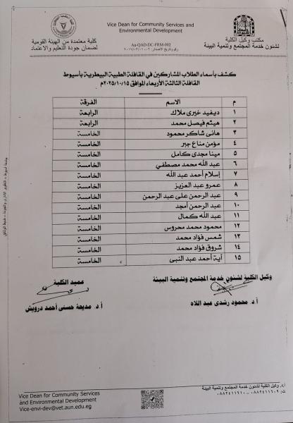 اسماء الطلاب المشاركين فى القافلة البيطرية 15-10-2025م