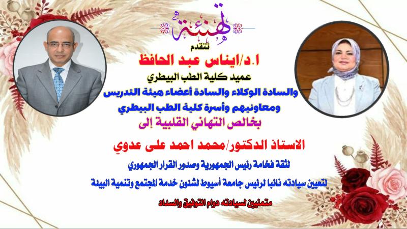 تهنئة ا.د /عميد الكلية واسرة كلية الطب البيطري لل ا.د / محمد احمد على عدوي لتعيين سيادته نائبا لرئيس جامعة أسيوط لشئون خدمة المجتمع وتنمية البيئة 11 نوفمبر 2025