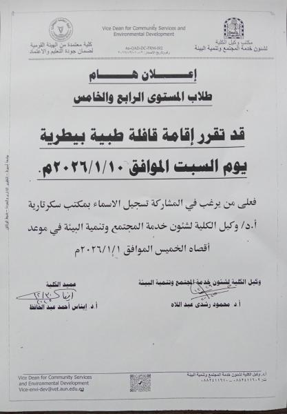 اعلان طلاب المستوى الرابع و الخامس - القوافل الطبية البيطرية 10-1-2026م