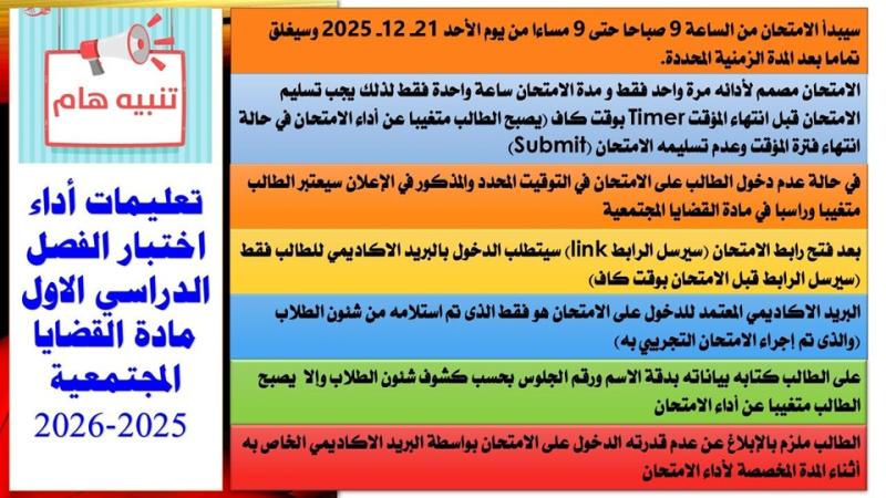 تعليمات أداء امتحان القضايا المجتمعية اون لاين 2025-2026