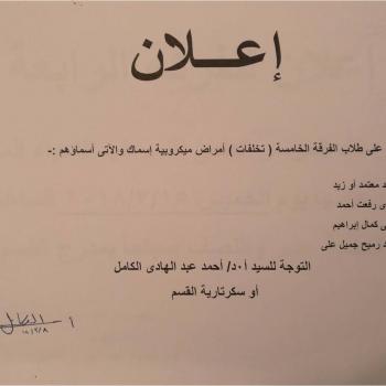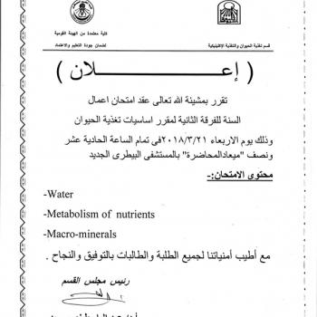 إعلان عن موعد إمتحان العملى فى مادة الصحة البيئية والتلوث للمستوى الخامس
