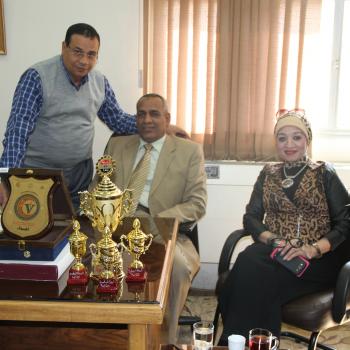 السيد الأستاذ الدكتور / حسن عباس محمد .. عميد الكلية ، وصورة تذكارية بالكؤوس التى حصلت عليها الكلية بالدورة البيطرية الثانية بكلية الطب البيطرى جامعة بنها