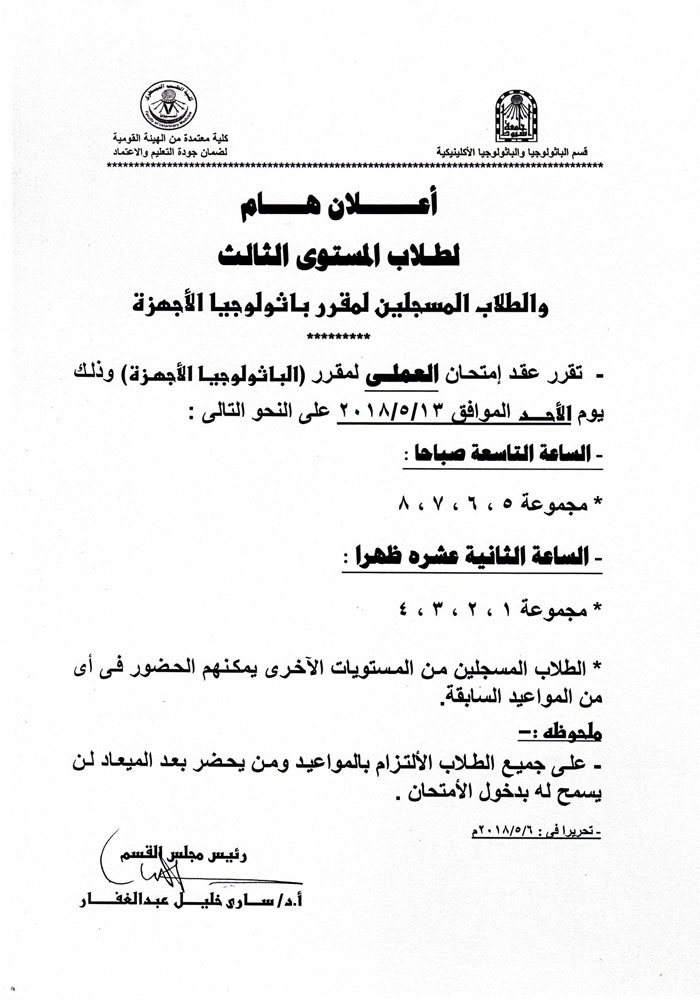 إعلان هام بخصوص مقرر باثولوجيا الأجهزة