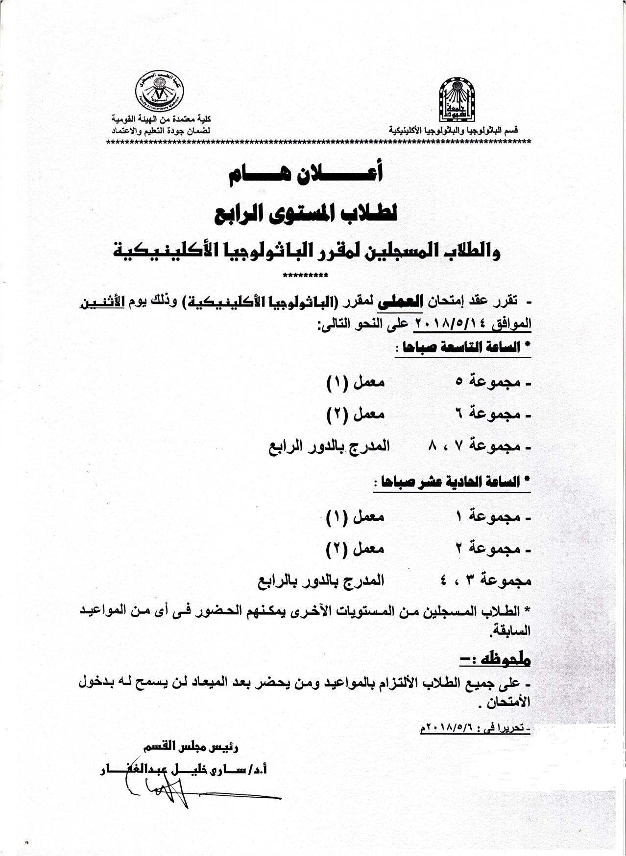 إعلان هام لطلاب المستوى الرابع خاص بإمتحان الباثولوجيا الإكلينيكية 7 مايو 2018 إعلان هام لطلاب المستوى الرابع خاص بإمتحان الباثولوجيا الإكلينيكية