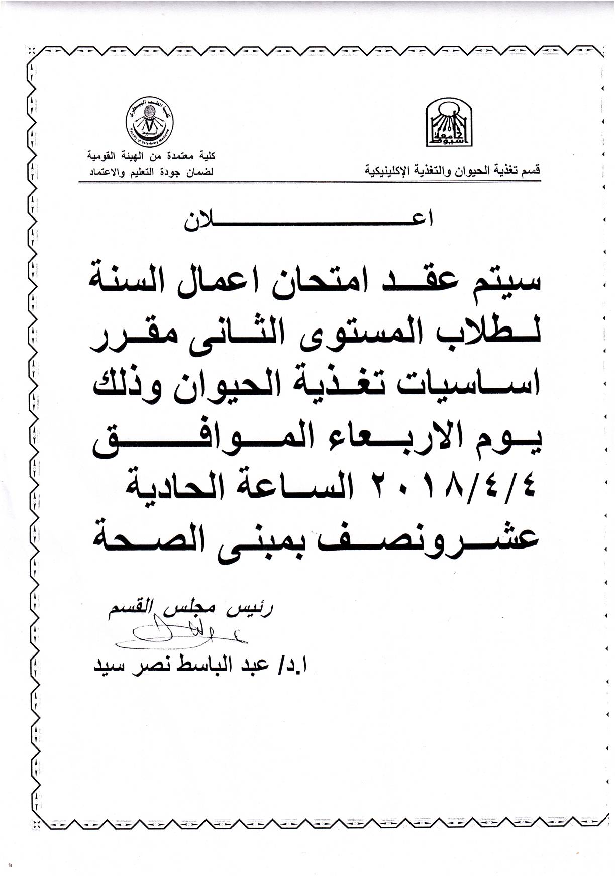 إعلان هام لطلاب المستوى الثانى بخصوص مقرر أساسيات تغذية الحيوان 1 أبريل 2018 إعلان هام لطلاب المستوى الثانى بخصوص مقرر أساسيات تغذية الحيوان