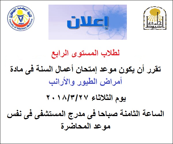 إعلان عن موعد إمتحان أعمال السنة فى مادة أمراض الطيور والأرانب - المستوى الرابع 13 مارس 2018 إعلان عن موعد إمتحان أعمال السنة فى مادة أمراض الطيور والأرانب - المستوى الرابع