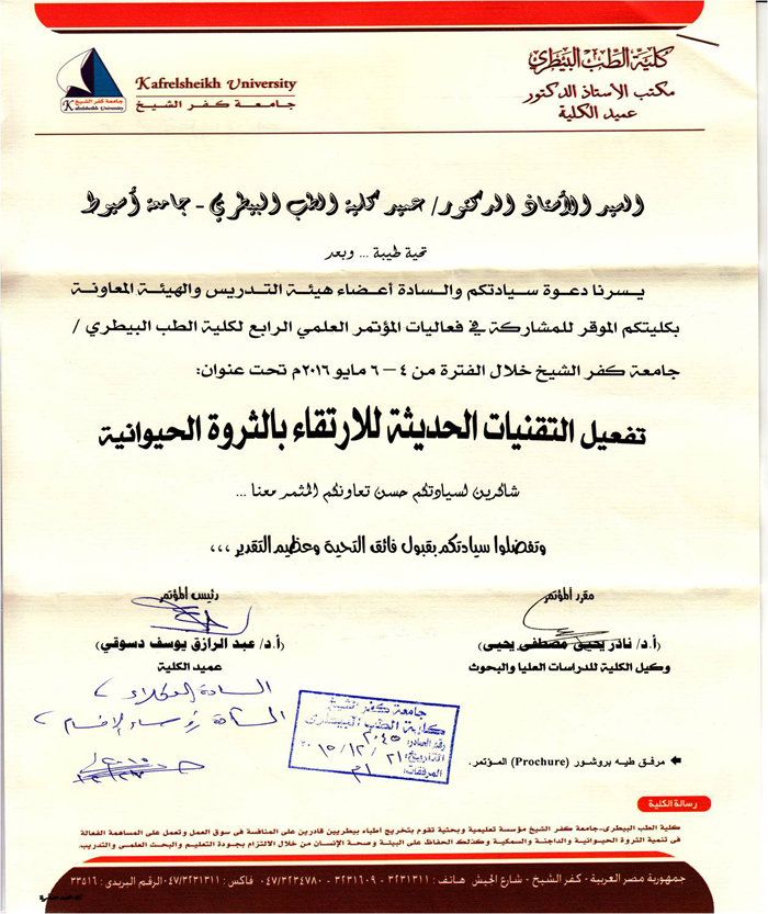 المؤتمر العلمى الرابع لكلية طب بيطرى جامعة كفر الشيخ خلال الفترة من 4-6 مايو 2016م 28 ديسمبر 2015 المؤتمر العلمى الرابع لكلية طب بيطرى جامعة كفر الشيخ خلال الفترة من 4-6 مايو 2016م MO