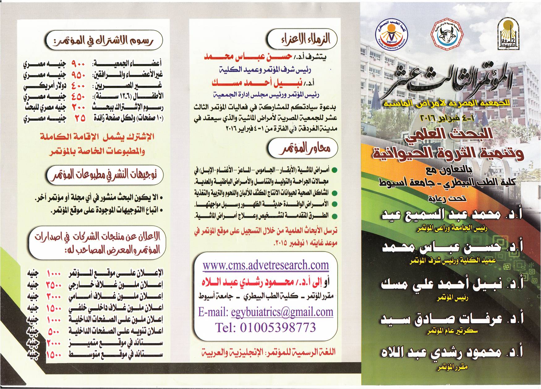 المؤتمر الثالث عشر للجمعية المصرية لأمراض الماشية بالتعاون مع كلية الطب البيطرى جامعة أسيوط 2 ديسمبر 2015 المؤتمر الثالث عشر للجمعية المصرية لأمراض الماشية بالتعاون مع كلية الطب البيطرى جامعة أسيوط