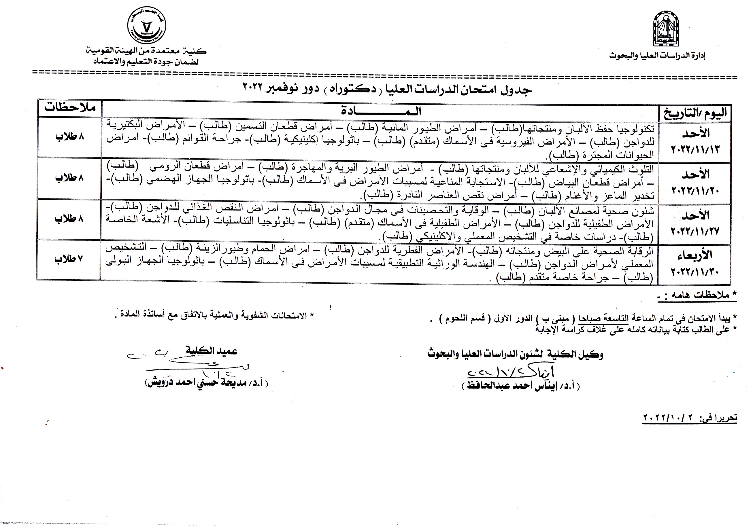 جدول امتحانات الدراسات العليا -دكتوراة