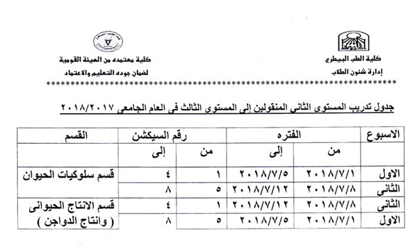 جدول تدريب طلاب المستوى الثانى المنقولين إلى المستوى الثالث صيف 2018 20 يونيو 2018 جدول تدريب طلاب المستوى الثانى المنقولين إلى المستوى الثالث صيف 2018