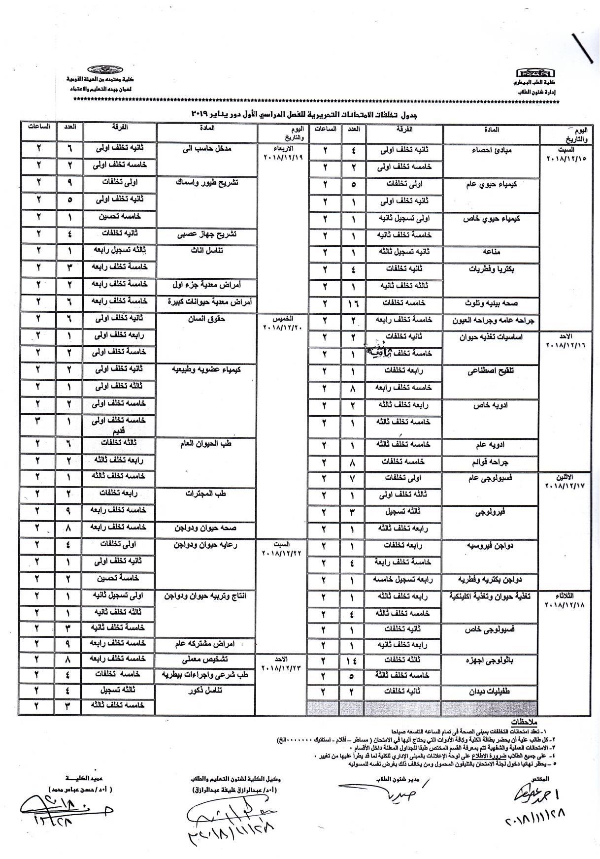 جدول تخلفات الإمتحانات التحريرية للفصل الدراسى الأول دور يناير 2019 هام جدا ( الحالة الوحيدة فقط ) التى يسمح فيها بالتعديل هى وجود ( إمتحانين ) لطالب فى نفس اليوم ، وفى حالة وجود ذلك عليه التوجه إلى إدارة شئون الطلاب ،