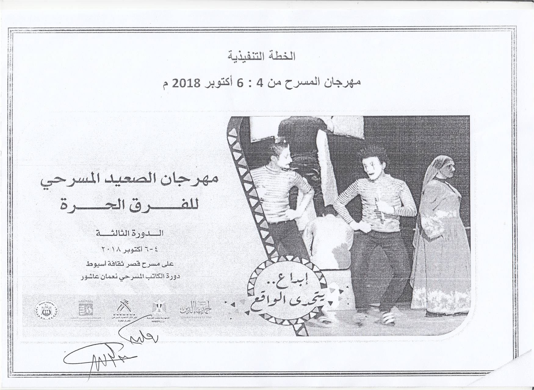 مهرجان الصعيد المسرحى للفرق الحرة 2 أكتوبر 2018 مهرجان الصعيد المسرحى للفرق الحرة الدورة الثالثة على مسرح قصر ثقافة أسيوط الخطة التنفيذية لمهرجان المسرح من 4:6 اكتوبر 2018