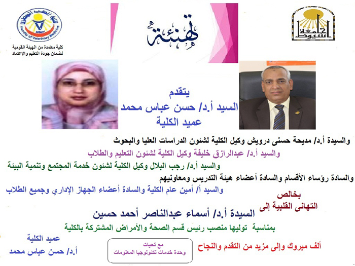 تعيين السيدة أ.د/ أسماء عبدالناصر رئيس مجلس قسم صحة الحيوان والأمراض المشتركة 18 سبتمبر 2018 تعيين السيدة أ.د/ أسماء عبدالناصر رئيس مجلس قسم صحة الحيوان والأمراض المشتركة