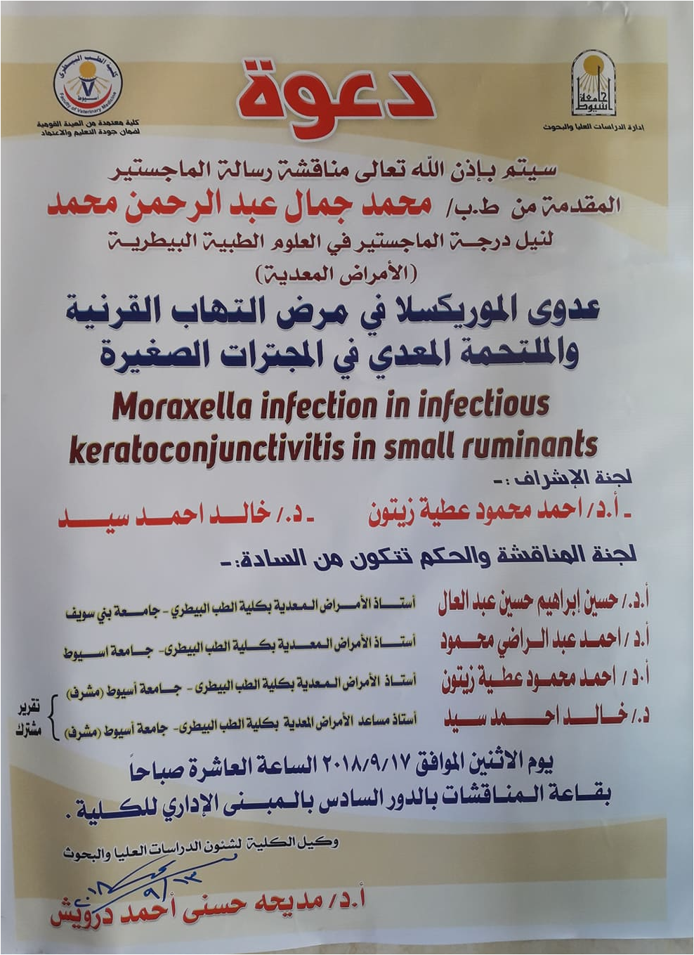 مناقشة رسالة الماجستير المقدمة من ط ب / محمد جمال عبدالرحمن لنيل درجة الماجستير فى الأمراض المعدية 16 سبتمبر 2018 مناقشة رسالة الماجستير المقدمة من ط ب / محمد جمال عبدالرحمن لنيل درجة الماجستير فى الأمراض المعدية