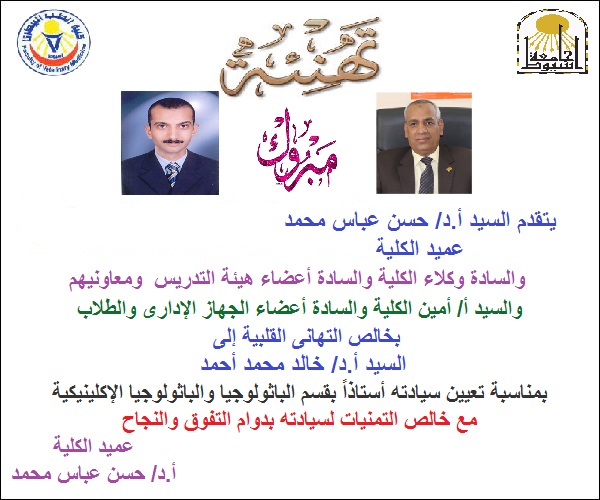 تهنئة مقدمة إلى السيد أ.د/ خالد محمد أحمد بقسم 16 سبتمبر 2018 تهنئة مقدمة إلى السيد أ.د/ خالد محمد أحمد بقسم" الباثولوجيا والباثولوجيا الإكلينيكية