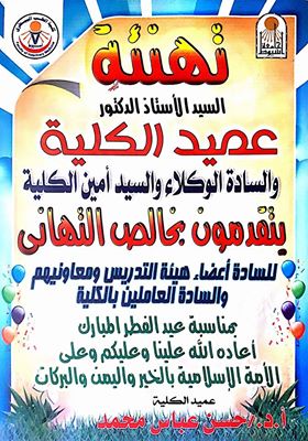 تهنئة من السيد أ.د/ عميد الكلية بعيد الفطر المبارك 6 يونيو 2018 تهنئة من السيد أ.د/ عميد الكلية بعيد الفطر المبارك