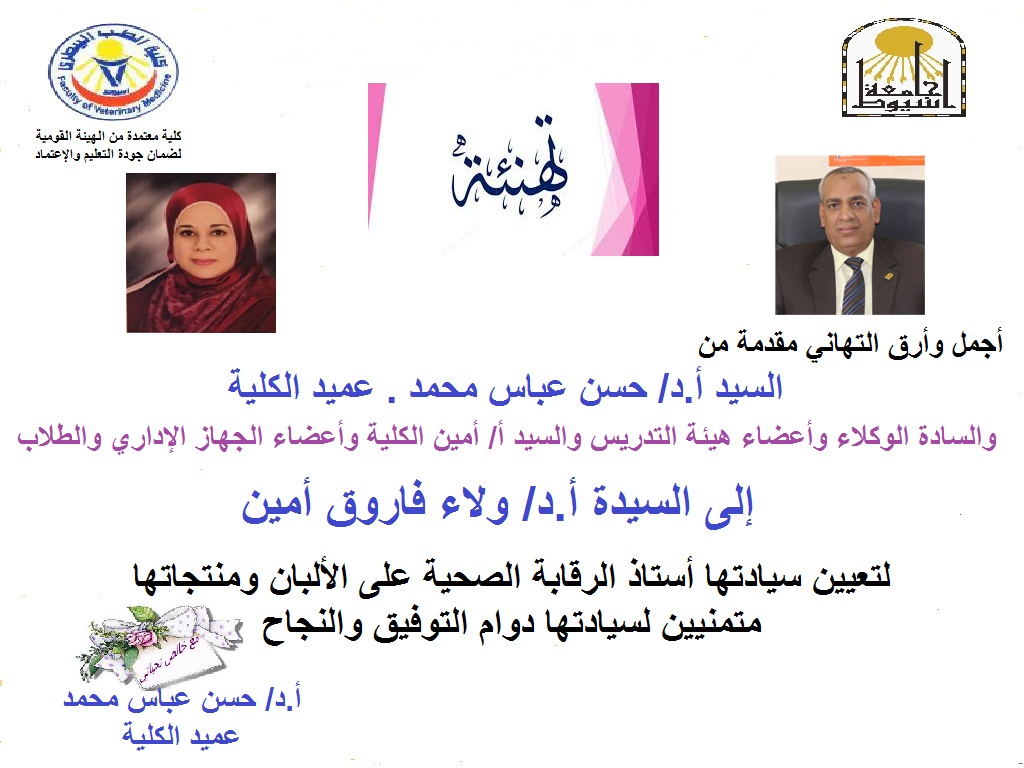 تهنئة إلى السيدة أ.د/ ولاء فاروق أمين لتعيين سيادتها أستاذ الرقابة الصحية على الألبان ومنتجاتها 6 مايو 2018 تهنئة إلى السيدة أ.د/ ولاء فاروق أمين لتعيين سيادتها أستاذ الرقابة الصحية على الألبان ومنتجاتها
