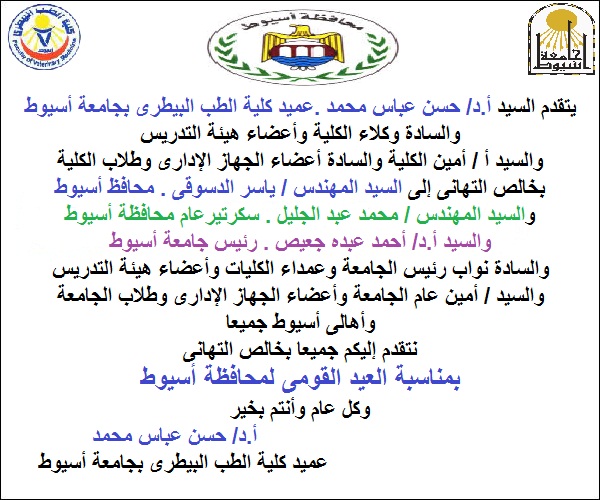 تهنئة من الكلية لقيادات المحافظة بمناسبة عيد أسيوط القومى 18 أبريل 2018 تهنئة من الكلية لقيادات المحافظة بمناسبة عيد أسيوط القومى