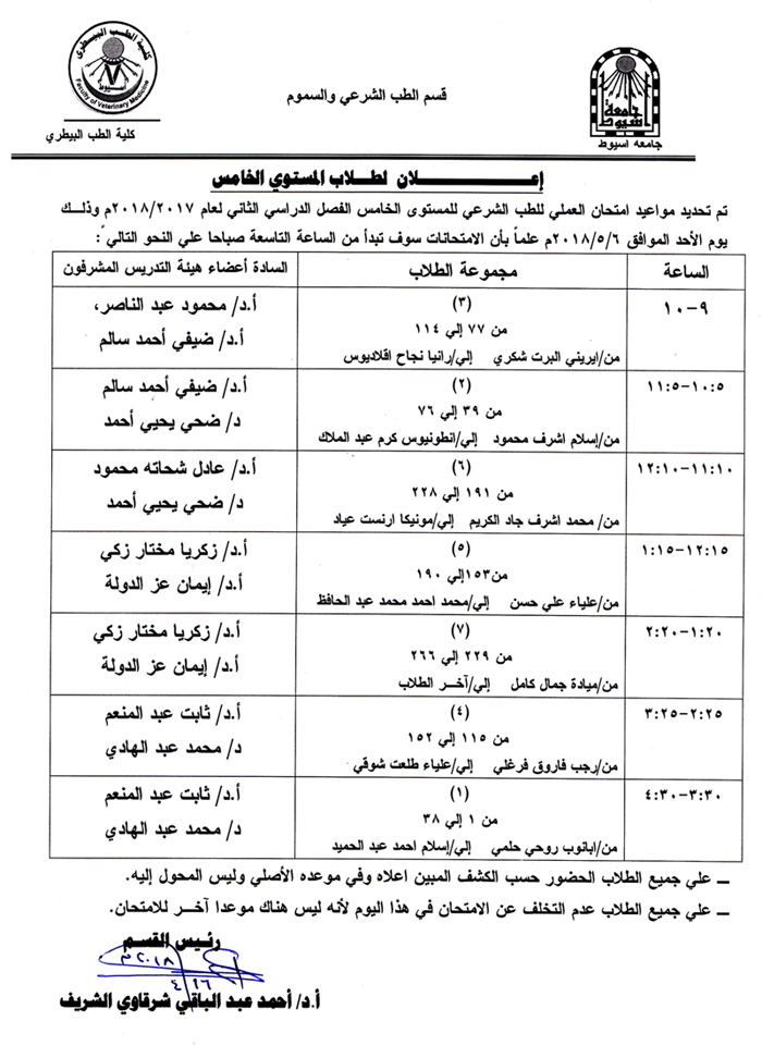 مواعيد امتحان العملى للطب الشرعى للمستوى الخامس 16 أبريل 2018 مواعيد امتحان العملى للطب الشرعى للمستوى الخامس