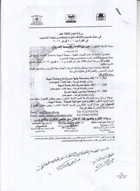 ورشة عمل بكلية الصيدلة فى مجال وتصميم واكتشاف الدواء باستخدام برمجيات الحاسب 16 ديسمبر 2015 ورشة عمل بكلية الصيدلة فى مجال وتصميم واكتشاف الدواء باستخدام برمجيات الحاسب