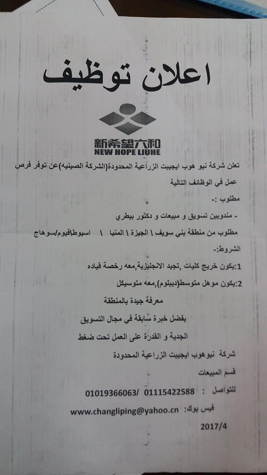 Employment Ad 20 June 2017 Important announcementA company that requests three newly graduated veterinarians, marketing and sales representatives in Assiut, Sohag and Minya (each governorate of one delegate)