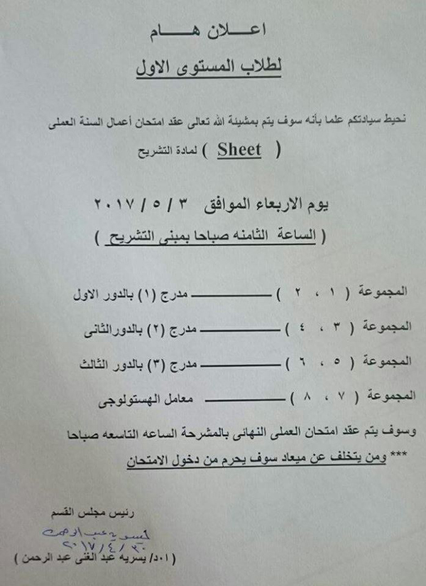 An important announcement for first level students regarding the anatomy exam 25 April 2017 An important announcement for first level students regarding the anatomy exam