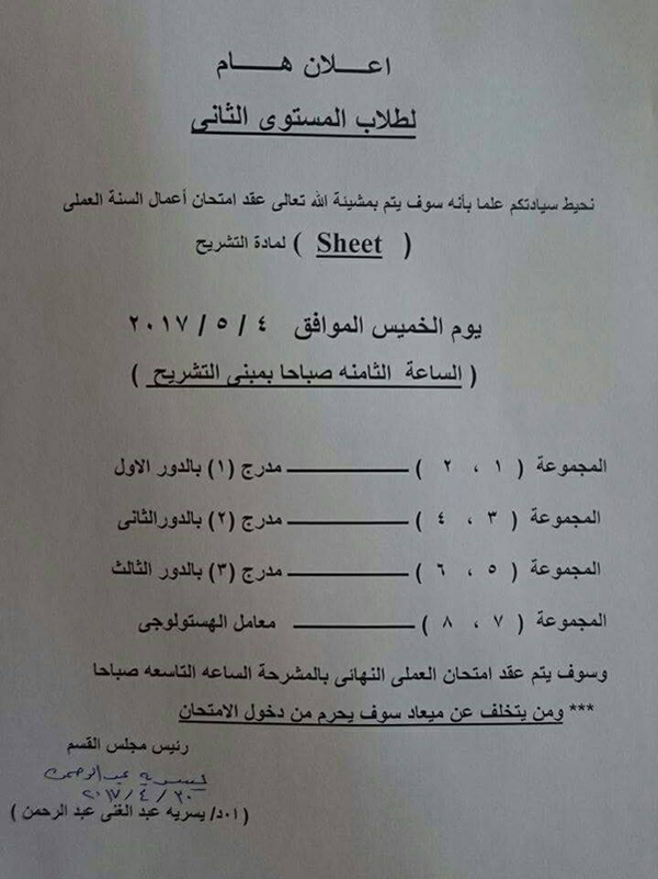 An important announcement for the second level students regarding the anatomy exam 25 April 2017 An important announcement for the second level students regarding the anatomy exam