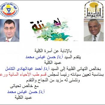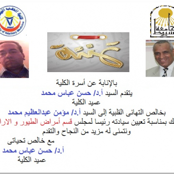 Congratulations to Mr. / Mo'men Azim MohamedOn the occasion of his appointment as Chairman of the Board of the Department of bird and rabbit diseases
