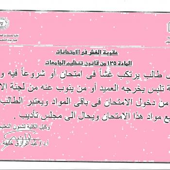 Punishment of cheating in examinations: Article 125 of the Law on Organizing UniversitiesAny student who commits a fraud in an exam or a project in it and is disciplined in the case of wearing it, is…
