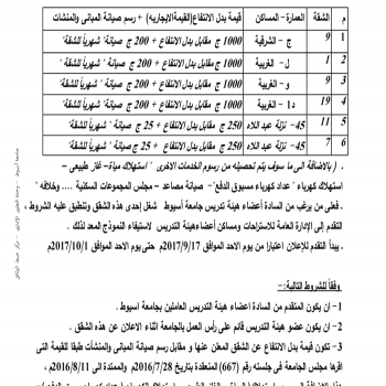 The General Administration of the dormitory in the dormitory of faculty members announces the existence of (6) vacant apartments in the dormitories of faculty members