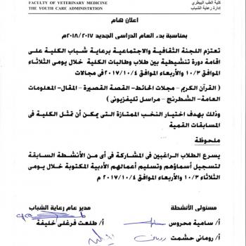 The reception of the new students on Monday 2/10/201712 noonIn the presence of Mr. / Hassan Abbas Mohamed DeanMr. Abdul Razek Khalifa, Vice Dean for Education and Students AffairsDr. Madiha Hosni…