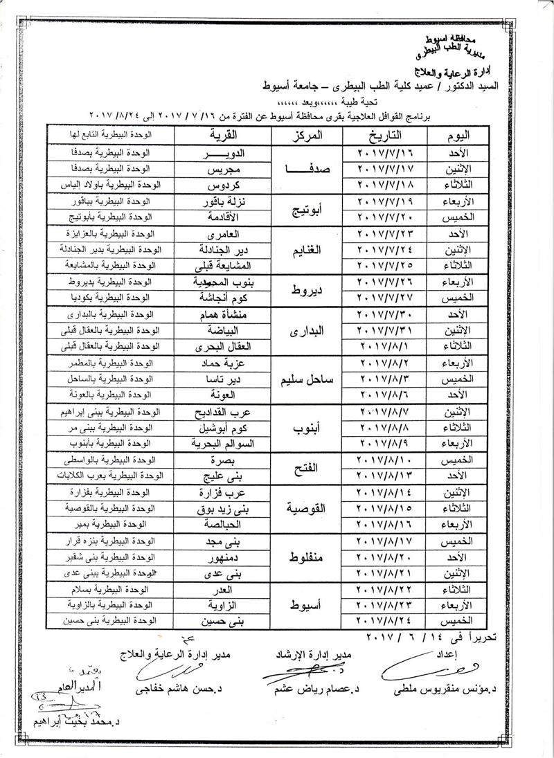 Program of therapeutic caravans in the villages of Assiut Governorate for the period from 16/7/2017 to 24/8/2017 12 July 2017 Program of therapeutic caravans in the villages of Assiut Governorate for the period from 16/7/2017 to 24/8/2017