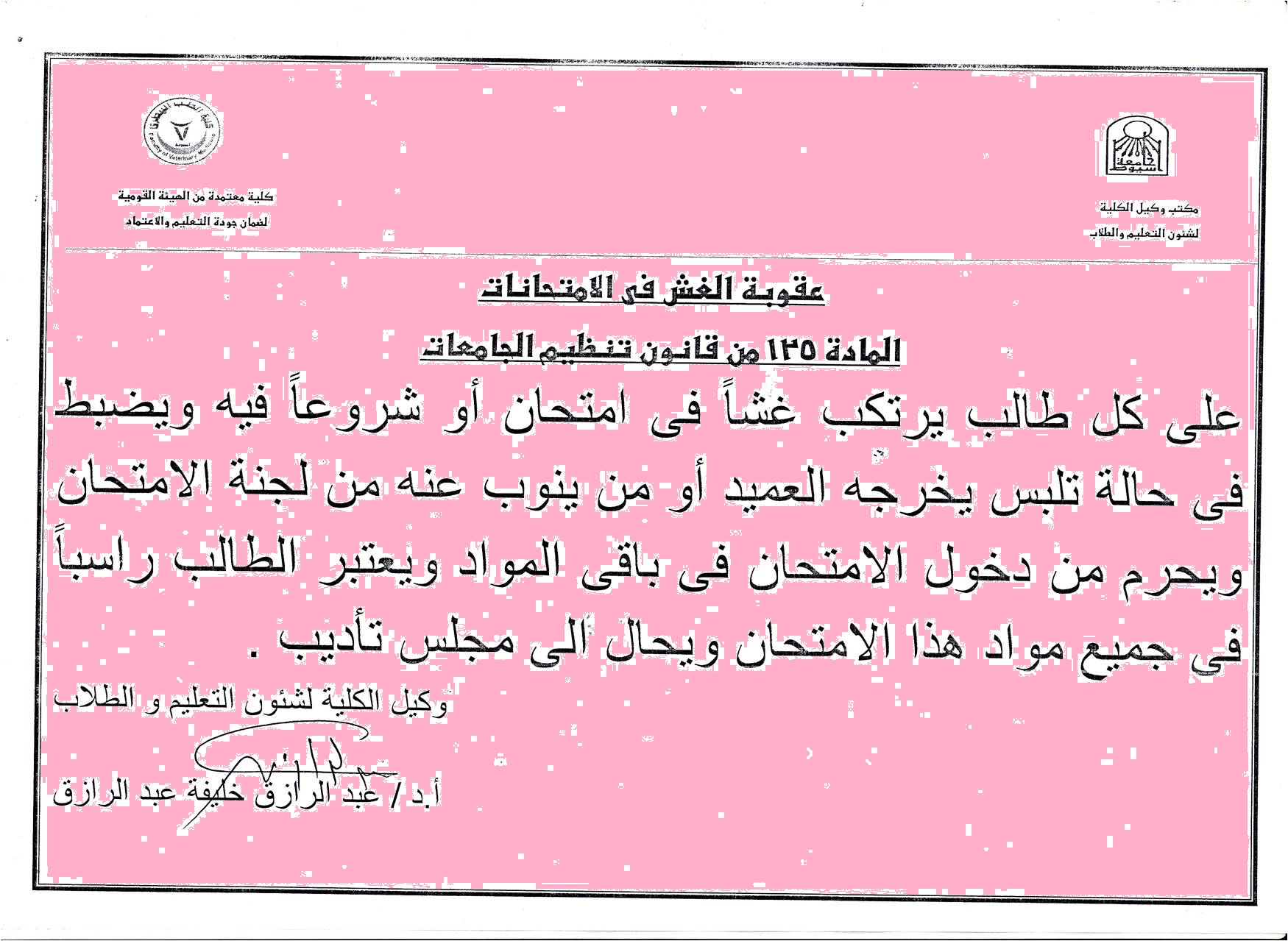 Punishment of cheating in examinations: Article 125 of the Law on Organizing UniversitiesAny student who commits a fraud in an exam or a project in it and is disciplined in the case of wearing it, is graduated by the Dean or his representative from the examination committee and is prohibited from entering the exam in the rest of the material. The student is considered to be a candidate in all the subjects of this exam,Vice Dean for Education and Student AffairsProf. Abdul Razek Khalifa Abdul Razek