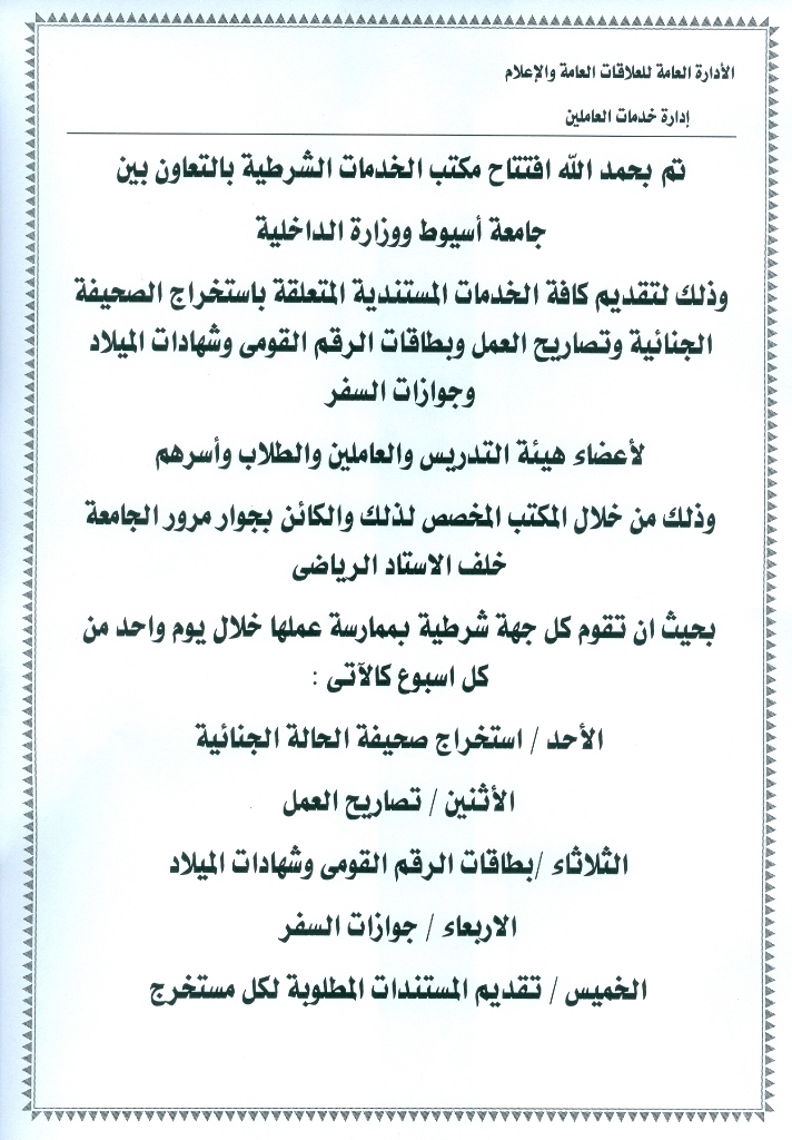 Services provided by the police services office in cooperation with Assiut University 12 April 2017 Services provided by the police services office in cooperation with Assiut University
