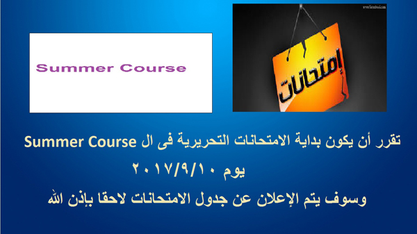 Summer Course exams on 10/9/2017 2 August 2017 It is decided that the beginning of the written examinations will be inSummer Courseday10/9/2017The announcement will not really be on the exam schedule