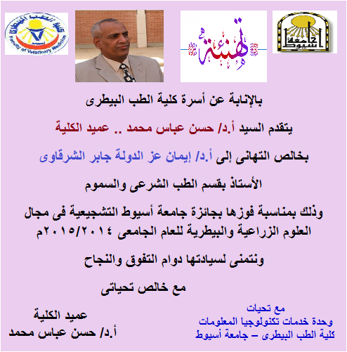 On behalf of the family of the Faculty of Veterinary MedicineMr. progressing D / Hassan Abbas Mohammed Dean of the CollegeSincere congratulationsTo D / Iman Ezz EldawlaProfessor of Forensic Medicine and Toxicology DepartmentAnd so for winning Assiut University Incentive AwardIn the field of agricultural and veterinary science for the academic year 2014/2016We wish her continued success and excellenceDean of the College