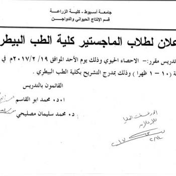 Teaching decide - vital statistics and on Sunday, 19 /  2/2017 promptly at the (10-1 pm) and that runway Anatomy, Faculty of Veterinary Medicine