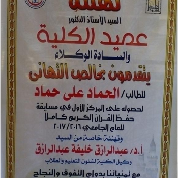 Congratulations from Mr. prof / dean of the college of the student / Hammad Hammad onOn winning first place at the university level in the Koran Memorising Contest