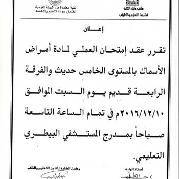 Decide to be a practical exam in fish rule the day12/10/2016 for the fifth level of a modern and fourth OldNine o'clock in the morning at the hospital Veterinary