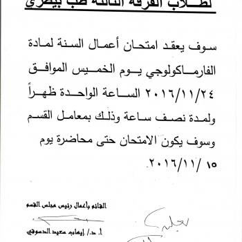 The realization of year exam in the subject of Pharmacology third level  On Thursday, 11/24/2016 13:00 pm for a period of half an hour A factor section Exam even lecture on 11/15/2016