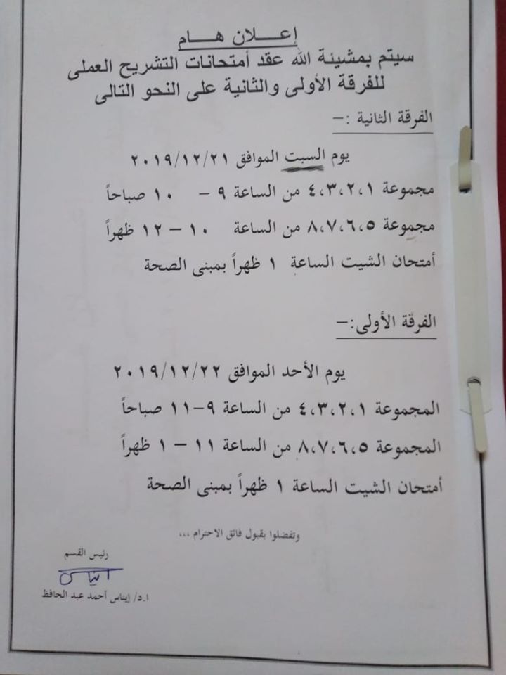 Important announcement for students of the third level and registered students immunity from the second levelThe animal and clinical nutrition exam date has been adjusted. To become Monday 13/1/2020 instead of Wednesday 1/1/2020And the immunology + registering exam was transferred again to become the exam on Wednesday 1/1/2020 instead of on Monday 13/1/2020