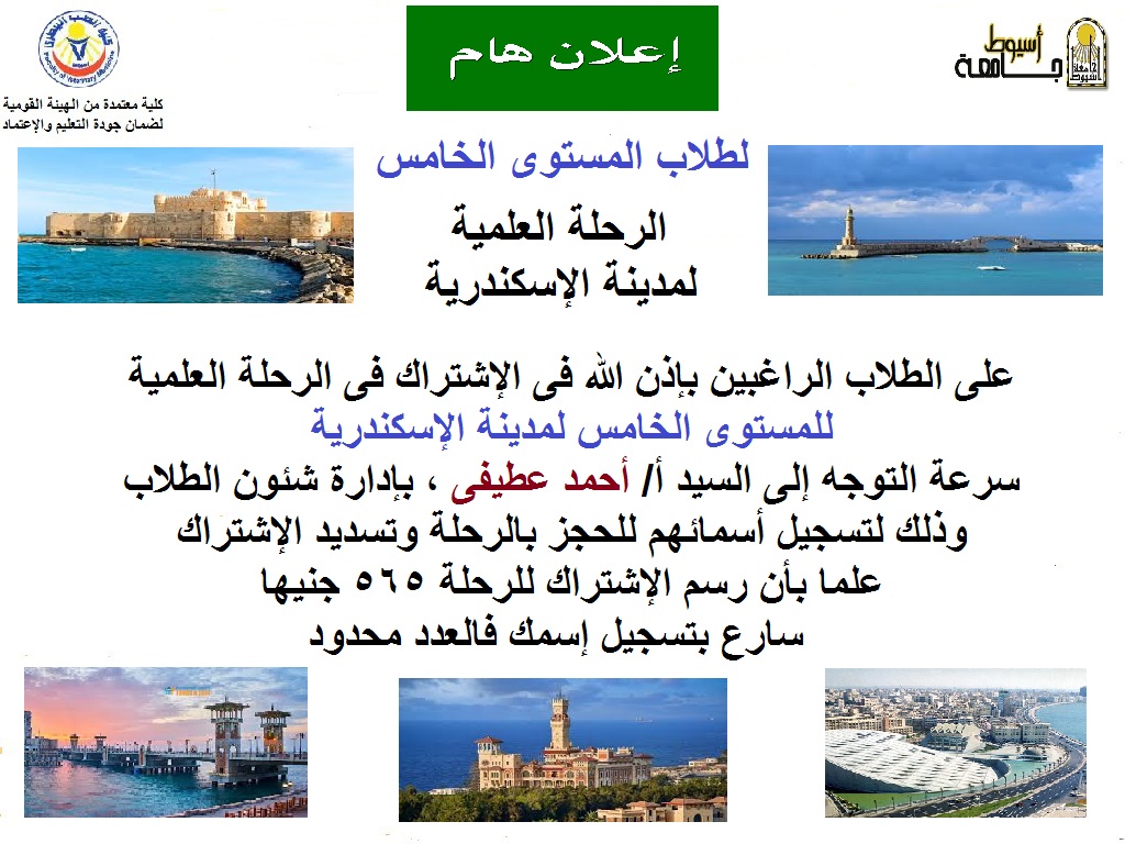 Students wishing to participate in the scientific trip for the fifth level of the city of AlexandriaFast approach to Mr. A / Ahmed Otaify, Student Affairs AdministrationIn order to register their names to book the flight and pay the subscriptionNote that the subscription fee for the trip is 565 poundsHurry to register your name, the number is limited